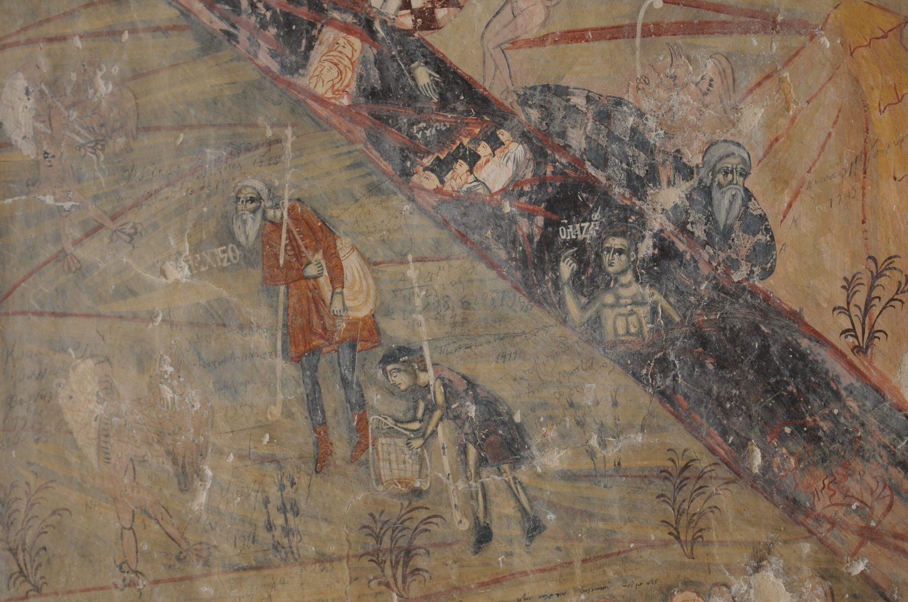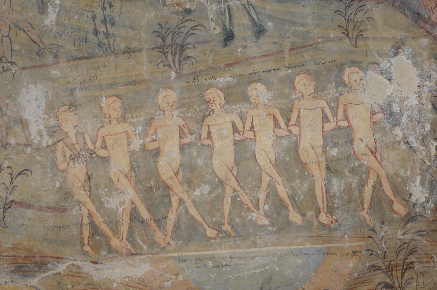 Στον εξωνάρθηκα του ναού, στην επιβλητική τοιχογραφία της Δευτέρας Παρουσίας που χρονολογείται στον 18ο αι., συναντούμε πολλές επιγραφές, άλλοτε χαραγμένες και άλλοτε γραπτές με μαύρο χρώμα. Κάποιες από αυτές είναι απλές χρονολογίες, από τον 18ο ως και τον 20ο αιώνα. Η παλαιότερη, που έχει εντοπιστεί έως τώρα, είναι η χρονολογία 1792. Οι τελευταίες ενθυμήσεις φτάνουν μέχρι το 1950. Ακόμη, υπάρχουν αριθμοί που συνοδεύονται από δυσανάγνωστα κείμενα και ίσως αφορούν αγοραπωλησίες. Τέλος, συναντούμε και απλά ονόματα επισκεπτών με την αναγραφή του έτους της επίσκεψής τους.