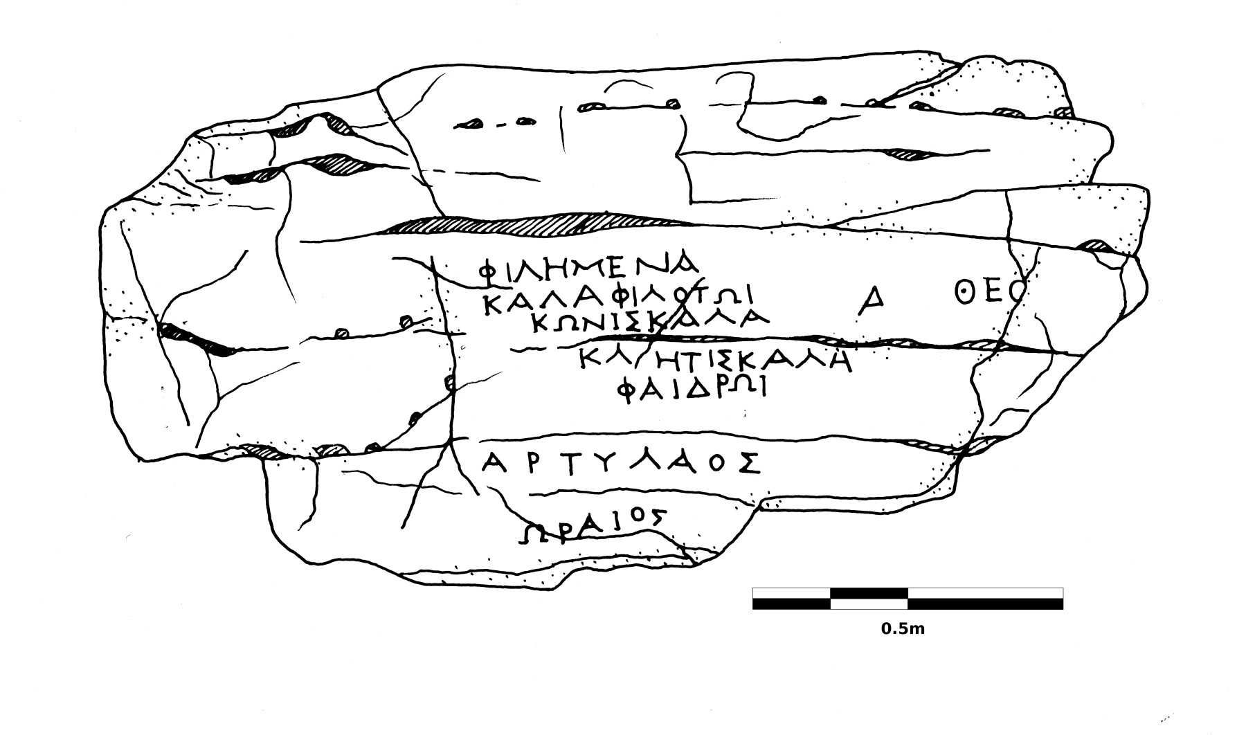 Το χάραγμα ήταν δίστιχο, ωστόσο, η επιφάνεια του λίθου είναι πολύ φθαρμένη και η προτεινόμενη συμπλήρωση παραμένει υποθετική.