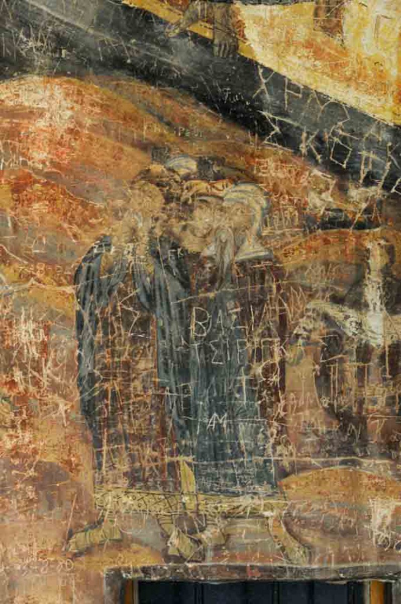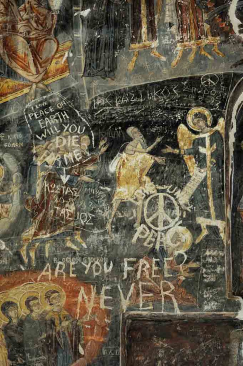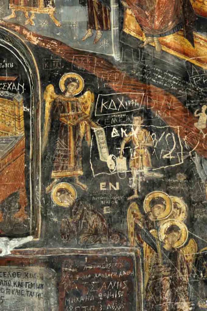 Οι τοιχογραφημένες επιφάνειες του ναού φέρουν σύγχρονα επιγραφικά χαράγματα της περιόδου 1945-2009, τα περισσότερα εκ των οποίων βρίσκονται στον εξωνάρθηκα, εκατέρωθεν της εισόδου και πάνω από αυτήν (εικ. 1).
