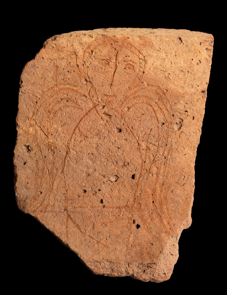 Τμήμα αρχαίας κεραμίδας με μεταγενέστερο χάραγμα φτερωτής μορφής