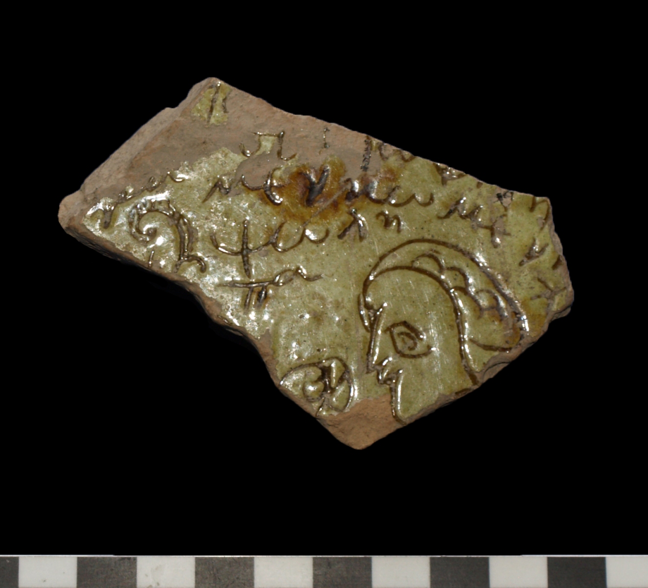Τμήμα βάσης και σώματος ανοιχτού εφυαλωμένου αγγείου (πιθανώς πινακίου), με αποσπασματικά σωζόμενη εικονιστική παράσταση στην εσωτερική του επιφάνεια, αποδοσμένη με αδρή χάραξη και σποραδικές καστανές κηλίδες (Incised / Coloured Sgraffito Ware). Εικονίζεται ανθρώπινη μορφή, ίσως γυναικεία, από την οποία σώζεται μόνο το κεφάλι, που είναι στραμμένο προς τα αριστερά, με αδιάγνωστο αντικείμενο μπροστά της (ίσως φαλλό). Πάνω από τη μορφή υπάρχει μικρογράμματη εγχάρακτη επιγραφή σκωπτικού χαρακτήρα, από την οποία διαβάζονται τα εξής: