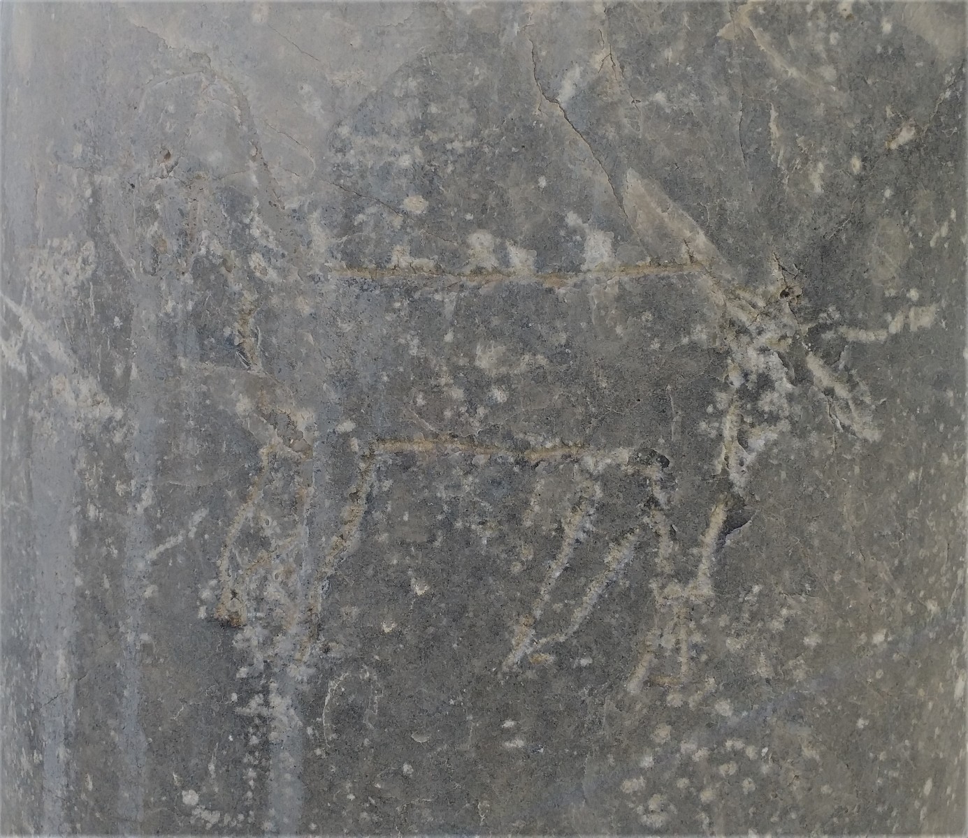 Εγχάρακτος ίππος στραμμένος προς αριστερά. Εικονίζεται σε βηματισμό με ψηλό λαιμό, μισάνοιχτο στόμα και ουρά που παραπέμπει σε κίνηση του ζώου.
