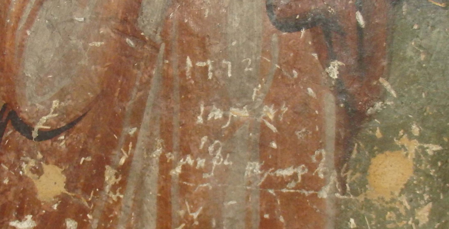η οποία χρονολογεί το νεότερο στρώμα τοιχογραφιών που εκτείνεται σε όλο τον ναό. Χαράγματα 18ου αι. αποκαλύφθηκαν στο αρχικό στρώμα τοιχογραφιών του διακονικού. Διακρίνεται η παράκληση προς όφελος πιστού:
