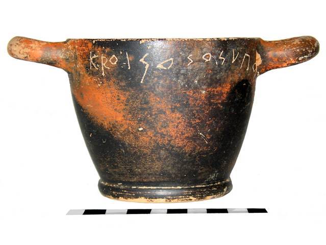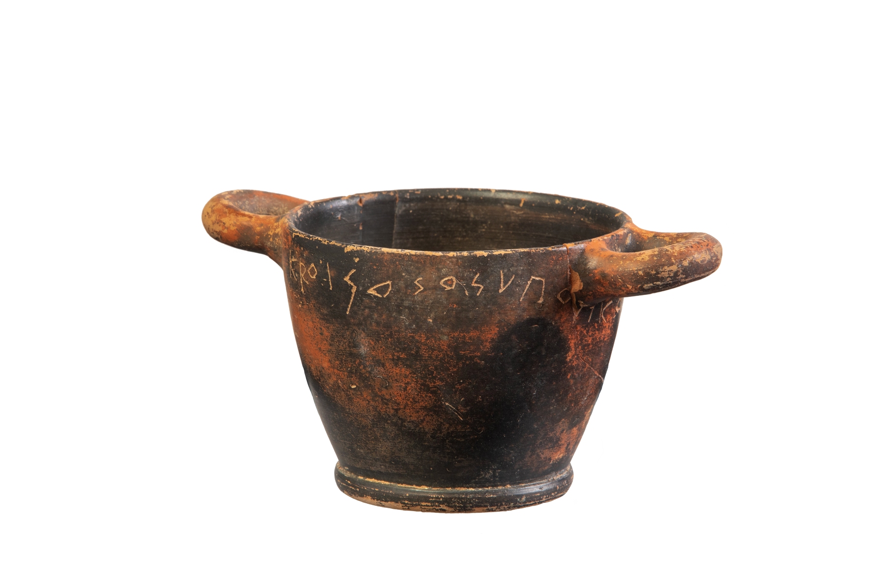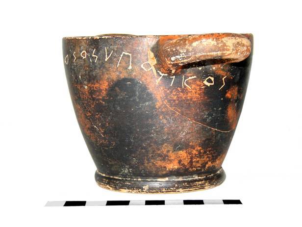 Μελαμβαφής σκύφος τύπου Α. Κάτω από το χείλος και τη δεξιά λαβή, graffito