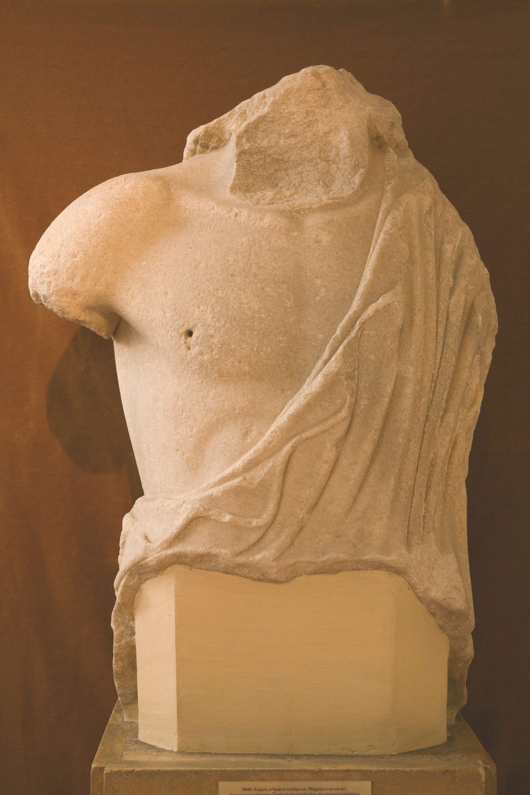 Κορμός καθιστού ανδρικού αγάλματος με εγχάρακτη επιγραφή